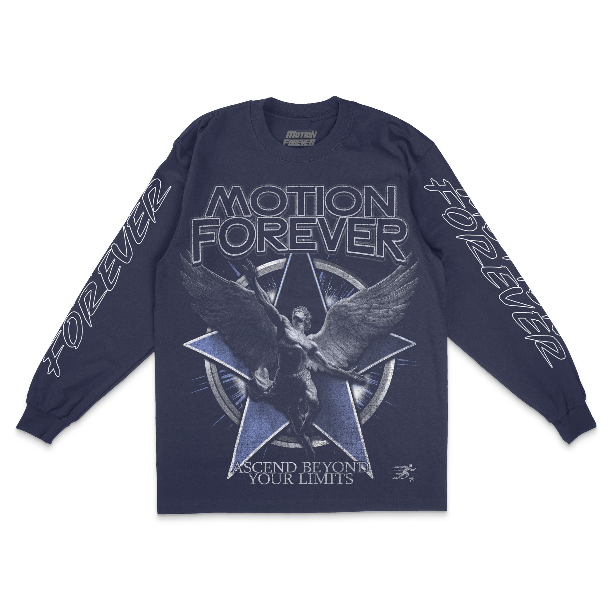 Long sleeve shirt is made from 100% heavyweight cotton, constructed for a structured fit and lasting durability. This garment features oversized MotionForever graphics printed on the chest, back, and sleeves. Order true to size.